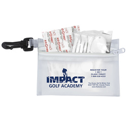 Golf with confidence knowing that you have everything you need to keep your game on track. Small size for convenient carrying. This zippered vinyl pack contains: 1 Golf Divot Tool, 5 Golf Tees, 2 Ball Markers and 4 Standard Latex Free Bandages.