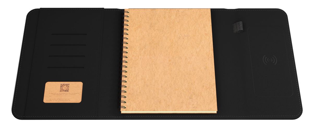 Practicality meets 21st-century technology with this multifunctional, wireless charging padfolio that features a built-in 4000 mAh power bank with a 3-in-1 integrated cable. The removable A5 recycled lined paper notebook is ideal for jotting notes, and the light-up logo brings a bit of fun to everyday office life. Includes RPET charging cable, premium gift box and 3-year warranty. Patent Pending.