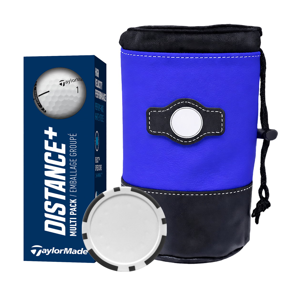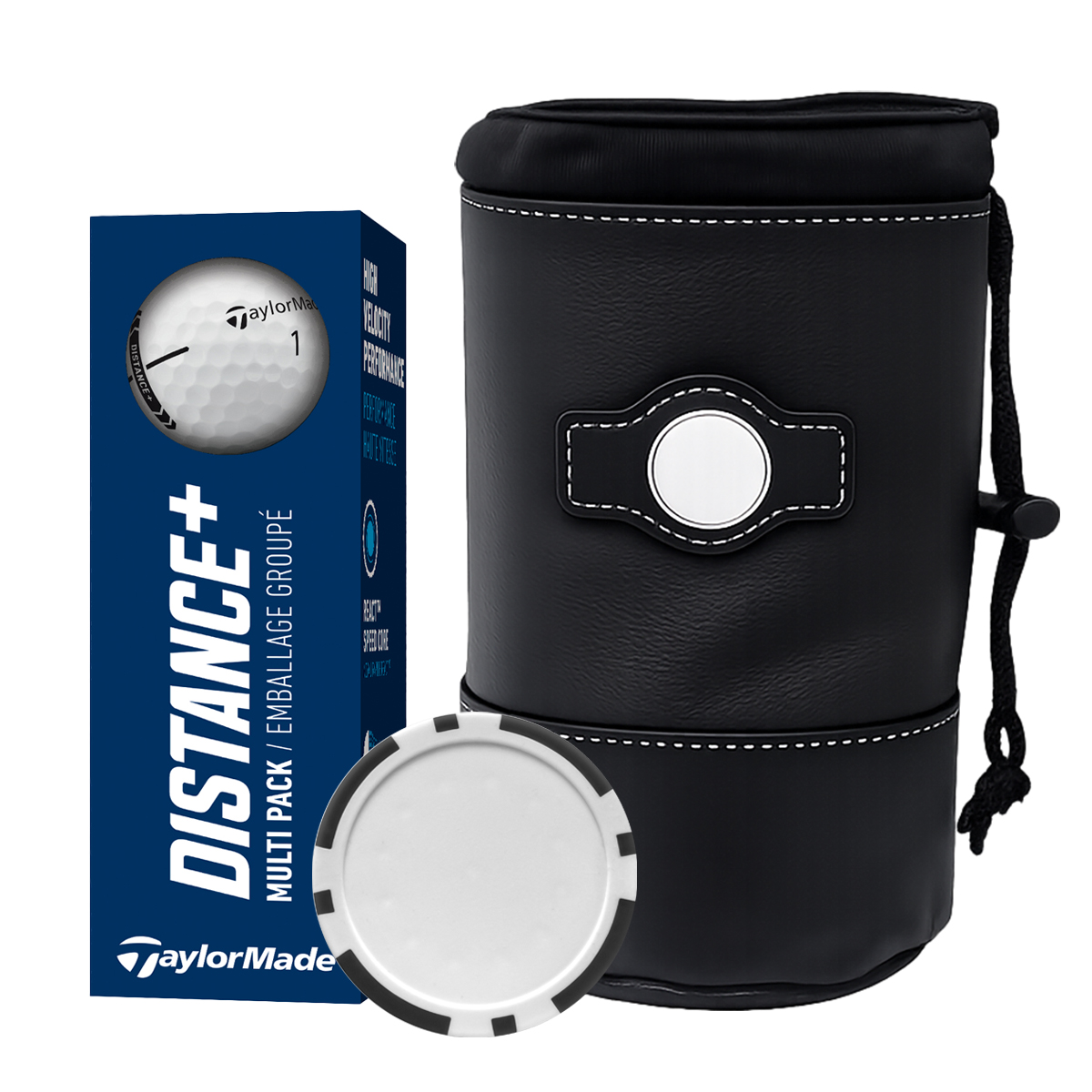 Designed for the value-minded golfer, this kit delivers quality and versatility at a great price, featuring three TaylorMade Plus golf balls and a poker chip ball marker packaged in a sleek synthetic leather cinch valuables pouch, with mix and match chip and bag color options to perfectly complement any corporate logo for tournaments, client gifts, and promotional events.