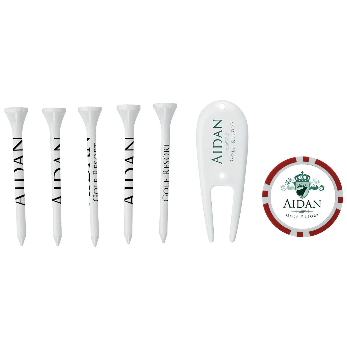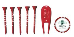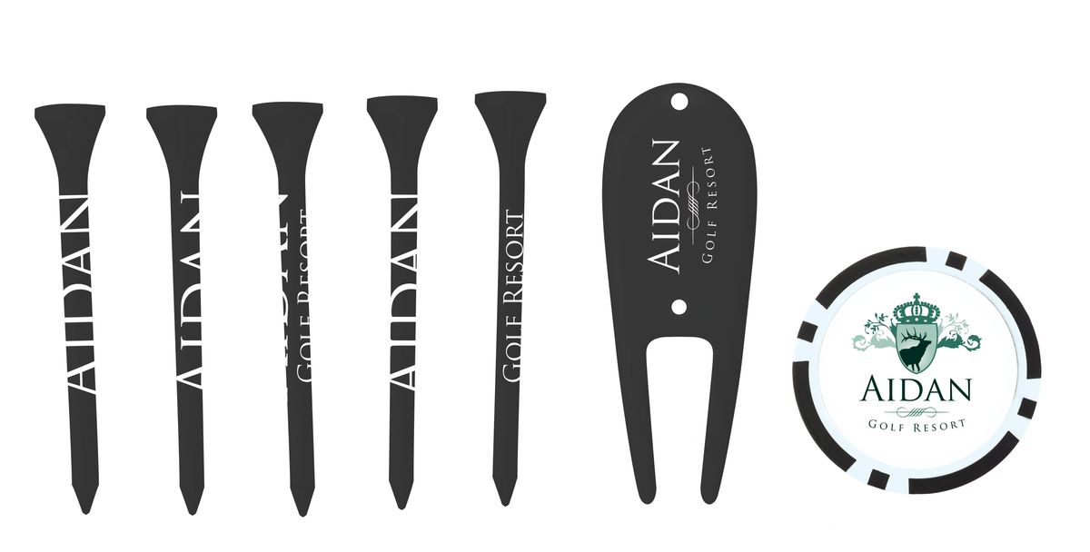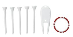 A classic golf promo that maximizes your brand exposure! This kit includes 5 imprinted 2-3/4" tees, 1 imprinted poker chip ball marker and 1 imprinted plastic divot repair tool in an individual polybag. Great for tournaments, outings and course giveaways.