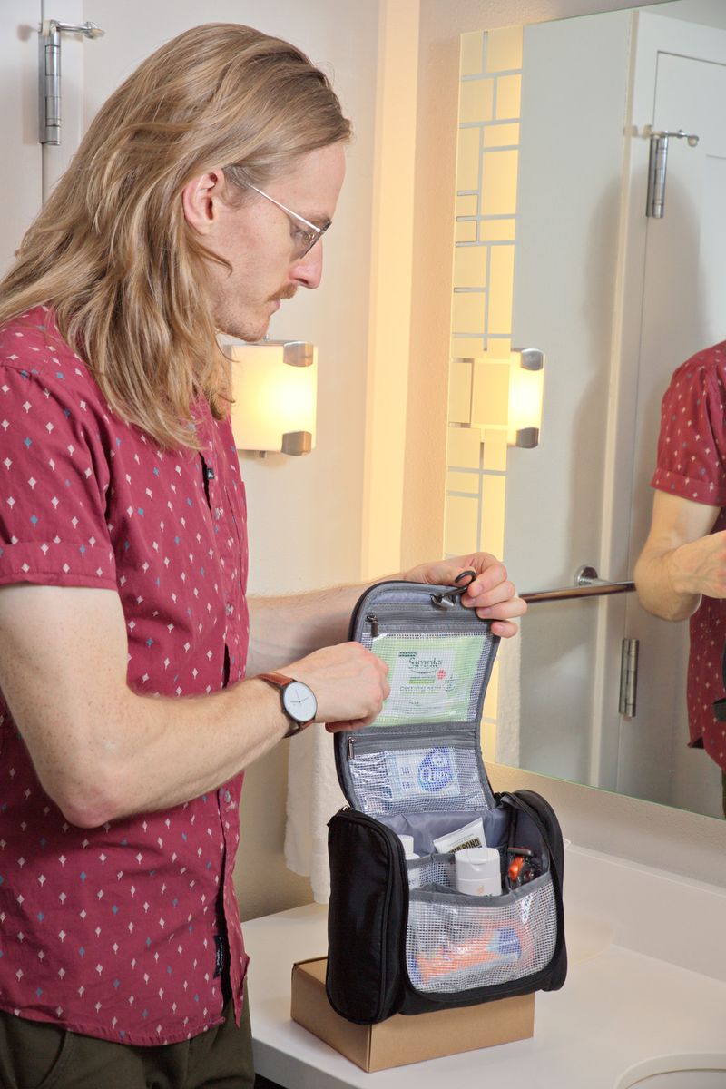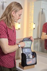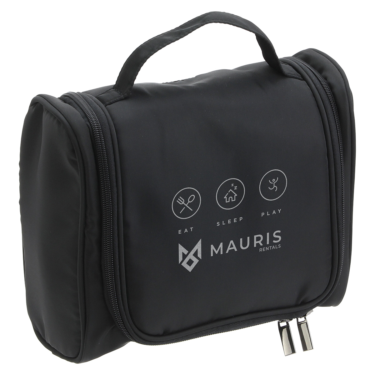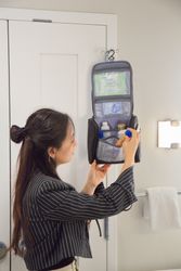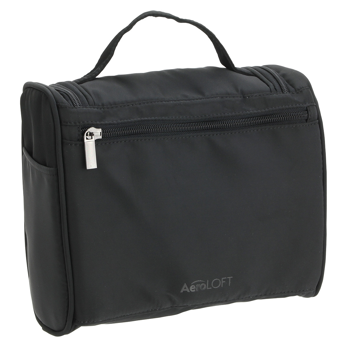 Travel with all your necessities! The AeroLOFT® Toiletry Kit features water-repellant nylon fabric with one exterior side pocket and a zippered back pocket. The main interior section has six mesh pockets and two zippered pockets on the top flap. The fold-out hanger allows you to hang the bag for easy access to all of your toiletries!