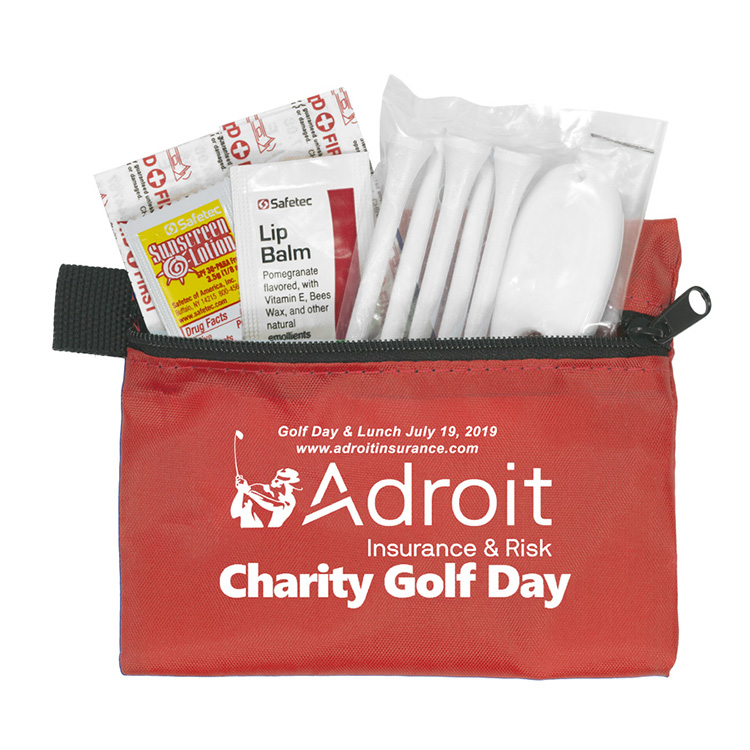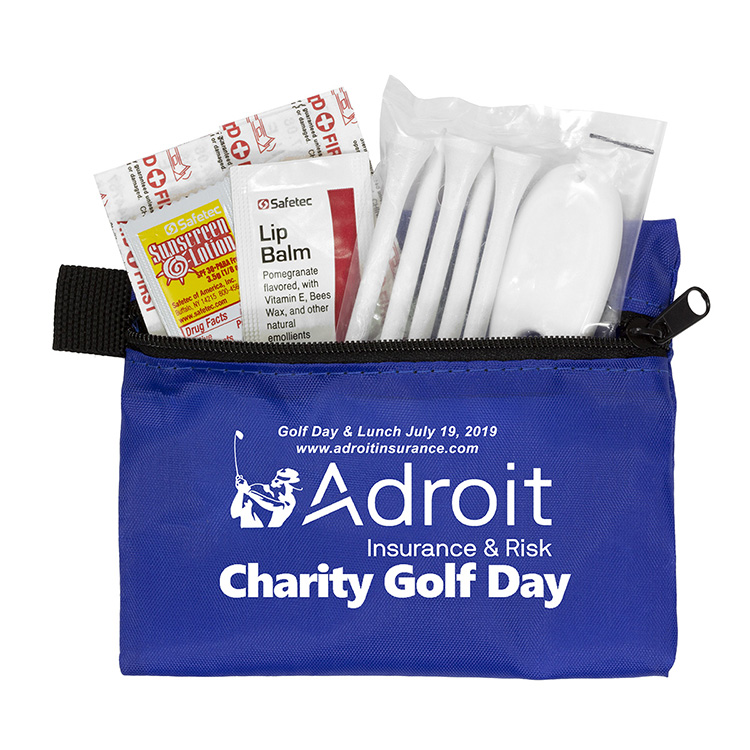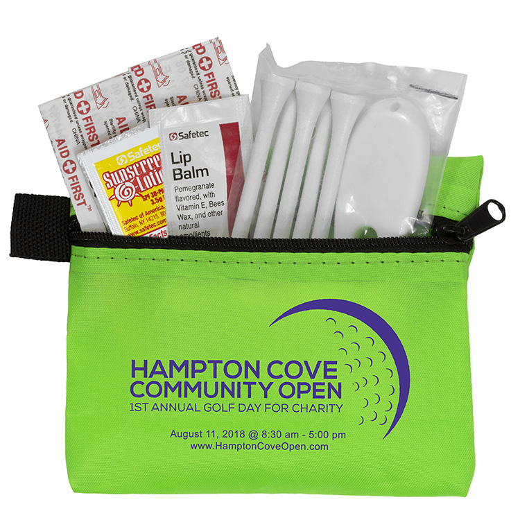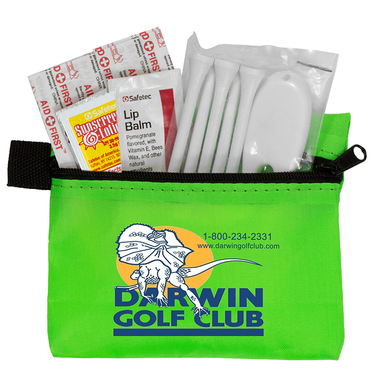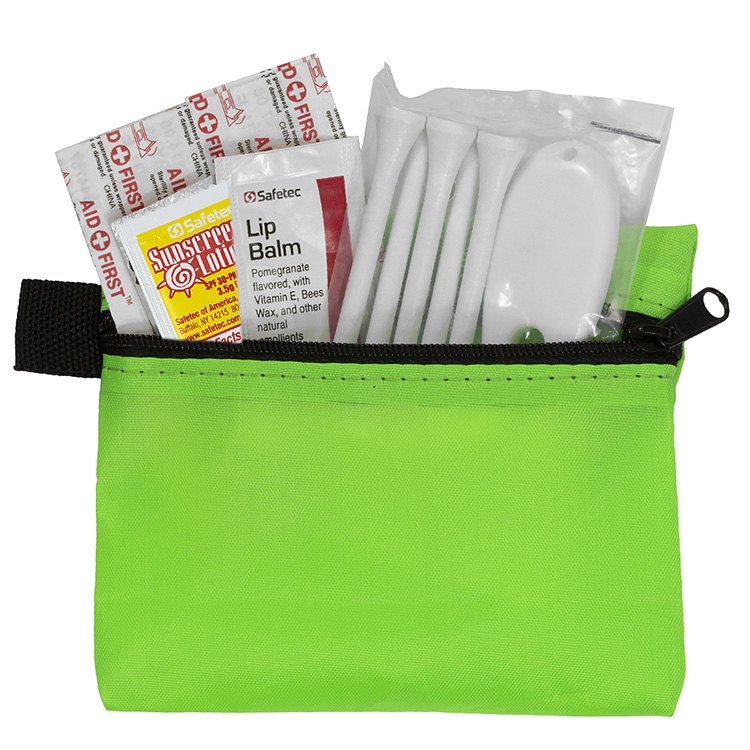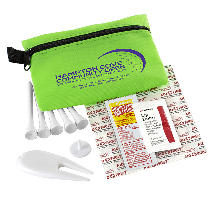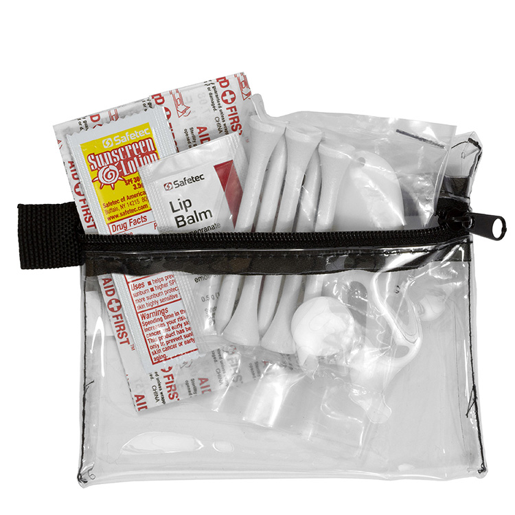 Golf with confidence knowing that you have everything you need to keep your game on track. Small size for convenient carrying. This zippered pack contains: 1 Golf Divot Tool, 5 Golf Tees, 2 Ball Markers, 4 Standard Latex Free Bandage, 1 Sunscreen Packet & 1 Lip Balm.